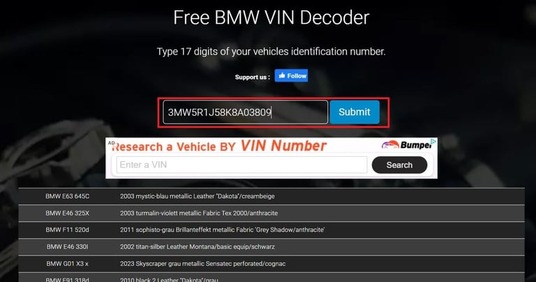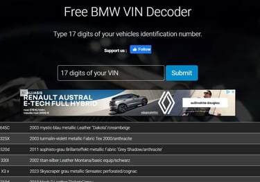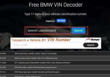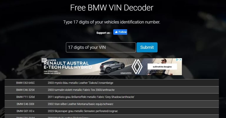 Įveskite automobilio VIN numerį ir paspauskite SUBMIT