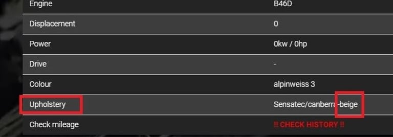 Upholstery eilutėje bus nurodytas spalvos kodas. Dažniausiai pasitaikantys bmw spalvos kodai būna tokie kaip: beige, oyster, moka, zimt braun, schwarz ir t.t.